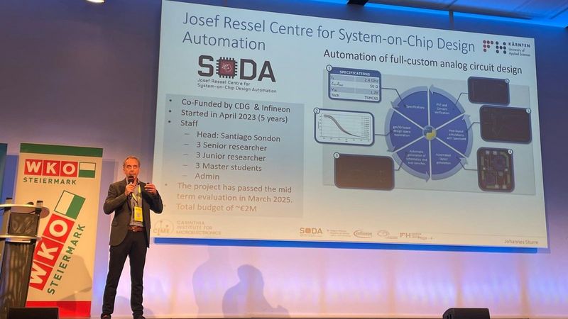 Im Pitch-Format Leading EDGE with Impact stellte die FH Kärnten das Josef Ressel Centre for Systems on Chip Design Automation vor. Das Projekt zeigte aktuelle Entwicklungen im Bereich Mikroelektronik und Systemdesign und unterstrich die Bedeutung anwendungsnaher Spitzenforschung.