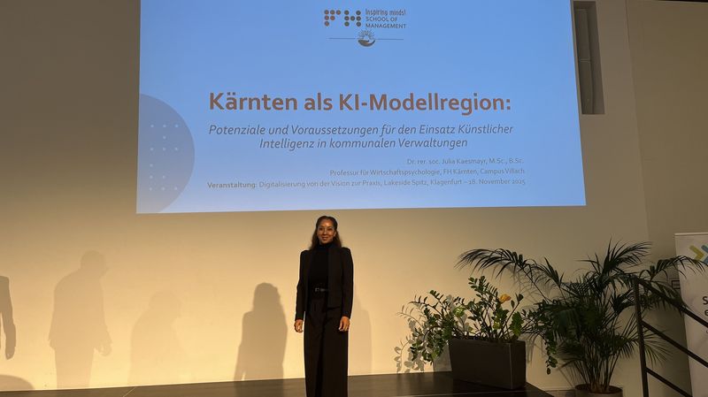 FH-Prof.in Dr.in Julia Kaesmayr (FH Kärnten) von der School of Management der FH Kärnten referierte kürzlich im Rahmen einer vom GSZ (Gemeinde Servicezentrum) organisierten Informationsveranstaltung (unter der Schirmherrschaft von LR Daniel Fellner) zum Thema Digitalisierung in Kärntner Gemeinden. In ihrer Keynote „Potenziale und Voraussetzungen für den Einsatz Künstlicher Intelligenz in den Kärntner Gemeinden“ zeigte sie eindrucksvoll, dass auch kleine Gemeinden bundesweit Maßstäbe setzen können – durch intelligente, menschenzentrierte Transformation.