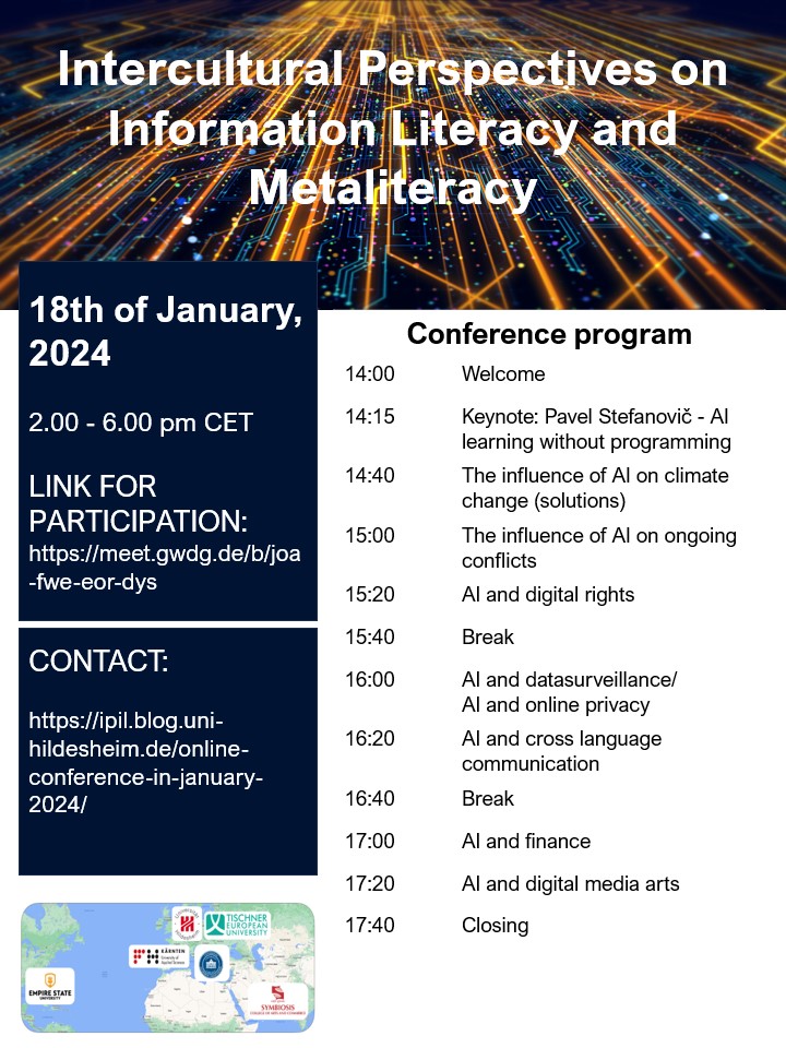 During the conference “Intercultural Perspectives on Information Literacy and Metaliteracy 2024” the students will present their final results, followed by a discussion with the international team of instructors and the audience. The conference will be opened with a keynote by Prof. Pavel Stefanovič from Vilnius Gediminas Technical University about "AI learning without programming".