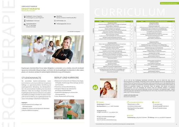 Das praxisorientierte Studium vermittelt neben ergotherapeutischen Fachkenntnissen relevante Inhalte aus den Natur-, Geistes- und Sozialwissenschaften. Die theoretischen Lehrinhalte werden kontinuierlich durch praktische und praxisnahe Erfahrungen in Form von Fallstudien, praktischen Übungen, Exkursionen zu therapeutischen und sozialen Einrichtungen, Praxisprojekten und mehreren Berufsprakika ergänzt. Dieser integrierende Ansatz ermöglicht es den Studierenden, das Gelernte unmittelbar anzuwenden und sich auf die beruflichen Anforderungen vorzubereiten. Zusätzlich wird durch die enge Verknüpfung von Wissenschaft und Praxis sichergestellt, dass die Ausbildungsinhalte stets aktuell und praxisnah sind und die Studierenden neue Erkenntnisse der Ergotherapie direkt in ihre berufliche Praxis integrieren können.