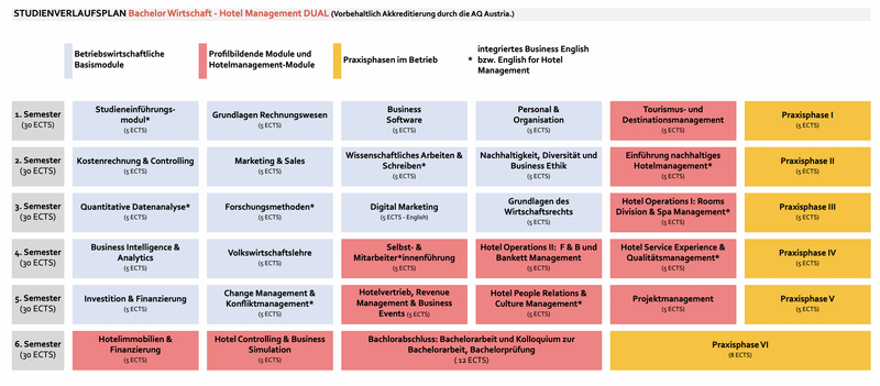 Die Anstellung im Hotel erfolgt durchgängig in einem Betrieb, teilweise mit der Option an anderen Standorten des Praxispartners. Parallel sind Sie an der FH Kärnten immatrikuliert – Theorie und Praxis sind fest miteinander verzahnt.